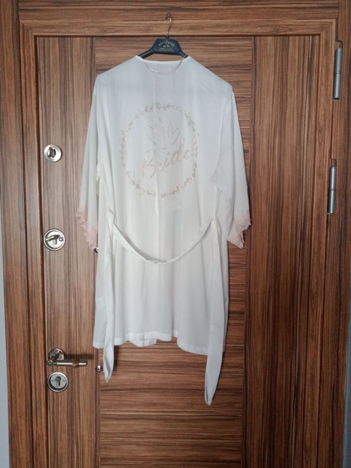 Bohem tarzda, uzun kollu ve bol kesim beyaz sabahlık.Bir kez giyilmistir temiz üründür Belde bağlama kemeri ve hafif baskılı desen detayları bulunur.