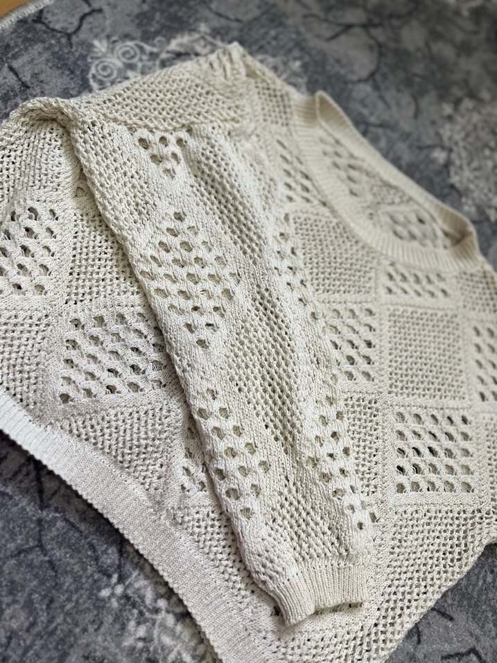 Bohem tarzda, beyaz örgü kumaştan, uzun kollu, salaş kesim ve kayık yaka kadın kazak. Rahat ve retro görünümlü.