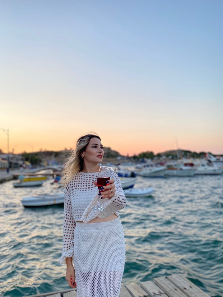 Beyaz renkli, uzun kollu, tekne yaka ve dantel detaylı bohem tarzda örgü midi elbise. Salaş kesimli, bağlama desenli, romantik akşamlar için uygun.