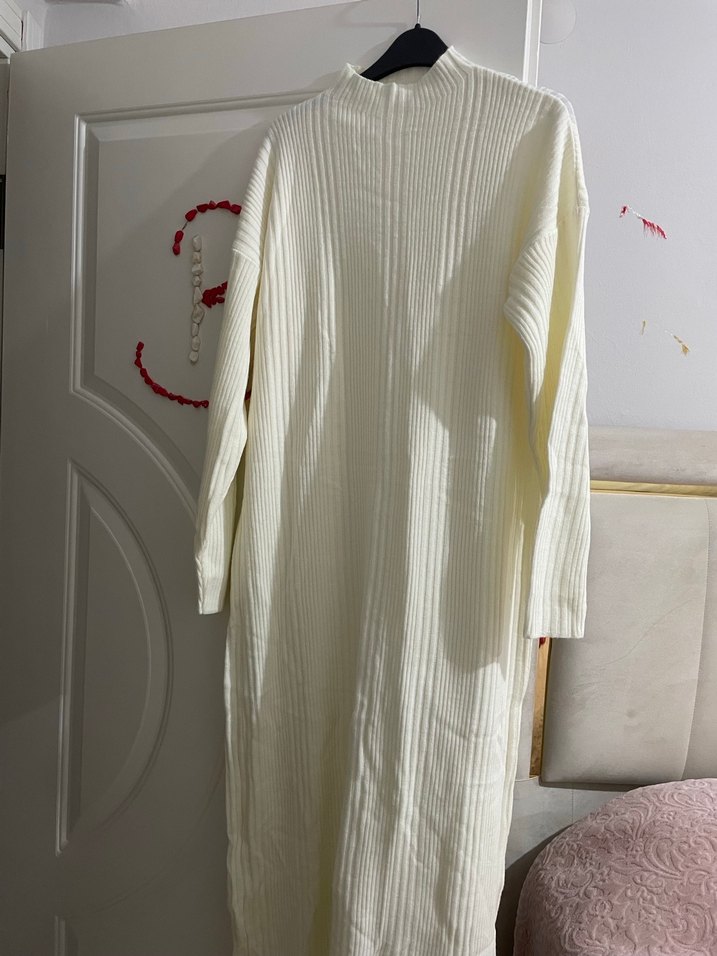 Bu beyaz, uzun kollu triko elbise, bol kesim ve boğazlı yaka detayına sahiptir. Bohem tarzı ve rahat triko kumaşıyla günlük kullanıma uygundur.