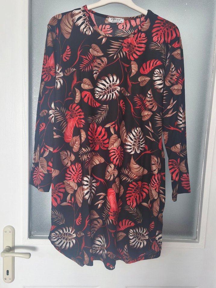 Uzun kollu, bisiklet yakalı, bol kesim ve drapeli bu tunik, koyu kiremit ve kahverengi yaprak desenli sentetik kumaştan yapılmıştır. Bohem tarz için uygundur. polaymid ölçüleri boy 90 cm göğüs:57 cm. likralı ve esnek