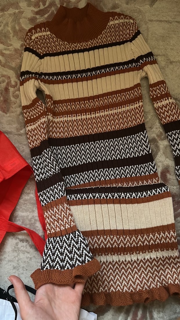 Fitted kahverengi uzun kollu, boğazlı, desenli triko kazak, rahat bohem tarzını yansıtır. Günlük kullanıma uygundur.