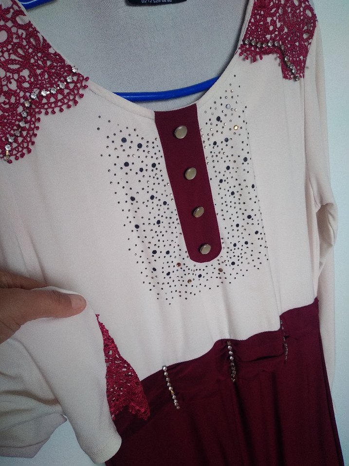 Bordo ve krem tonlarında, uzun kollu, v yaka, düğmeli ve nakış detaylı bohem tarzda boydan elbise. Günlük kullanıma uygundur. kolda az sökük var