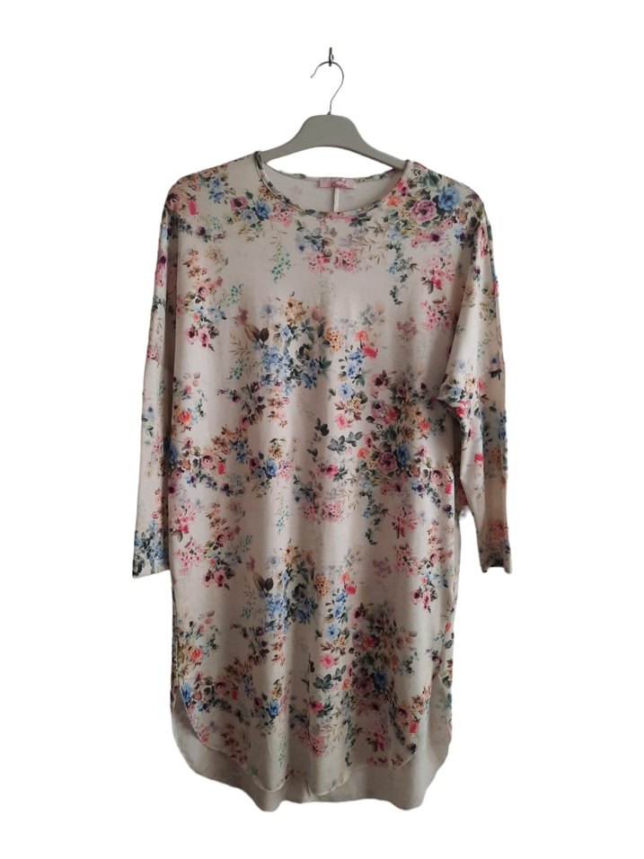 Bej renkli, bohem tarzda, uzun kollu ve yuvarlak yakalı, gevşek kesim kadın tunik. Yumuşak sentetik kumaştan, pastel çiçek desenli ve örgü dokulu, günlük kullanıma uygun.