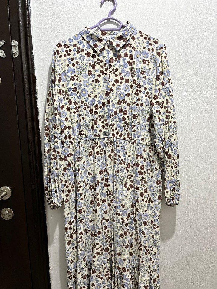 Düğmeli, yakalı uzun ve bol kesim elbise. Sentetik kumaştan yapılmış, pastel çiçekli batik deseni ile bohem tarzına uygun.