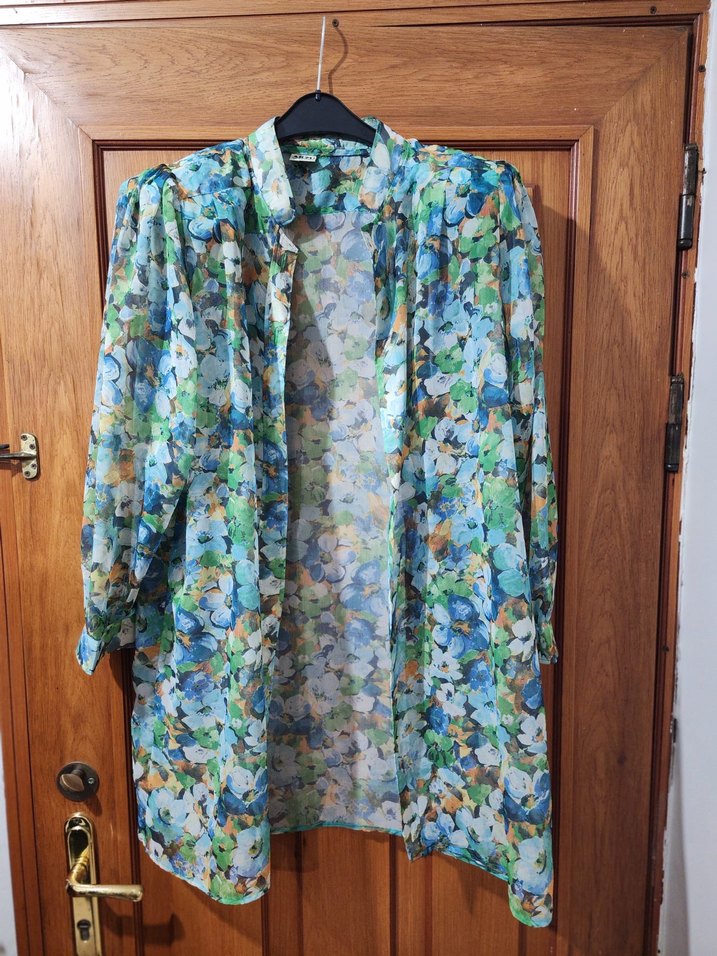 Bu uzun, bol kesim kadın gömlek, çok renkli pastel batik desenli, yakası kesik ve düğmeli. Yumuşak tekstil malzemeden yapılmış, günlük kullanıma uygun bohem tarzda. Vatka yakalı
