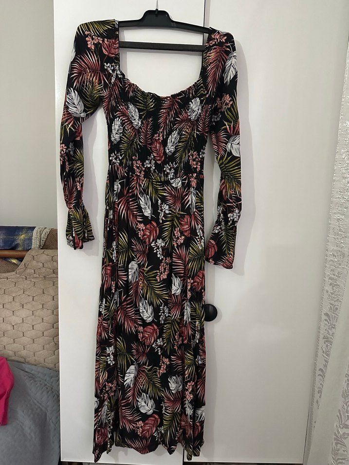 Bohem tarzda, uzun kollu ve straplez yakalı, çok renkli pileli desenli, sentetik kumaştan yapılmış dar kesim elbise. Günlük kullanım için uygundur.