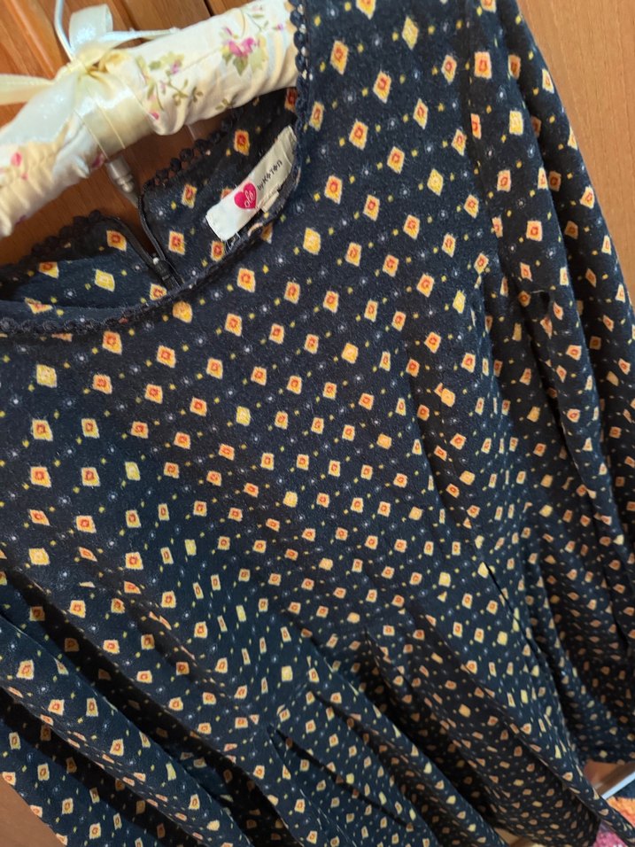 Uzun kollu, V yakalı, düğmeli, koyu renkli çok desenli bohem tarzda bol kesim elbise, günlük kullanım için uygundur.