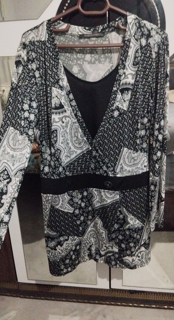 Uzun kollu ve düğmeli bohem desenli . Bol kesimli, koyu gri renkli ve günlük kullanıma uygun. İster elbise ister tunik olarak kullanabilirsiniz.