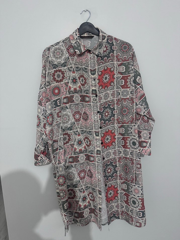 Bohem tarzda uzun kollu, bol kesim ve yakalı gömlek. Canlı çok desenli tekstil, düğmeli, günlük kullanıma uygun.