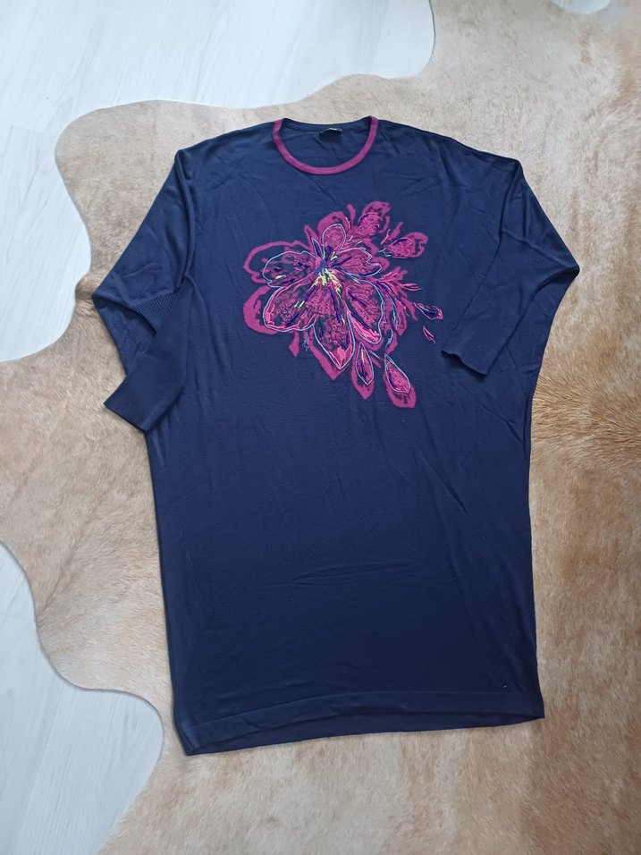 Bohem tarzda, uzun boylu, kısa kollu, yuvarlak yaka, koyu mor renkli, ipeksi kumaştan bol kesim hamile tişörtü, büyük çiçek baskılıdır.