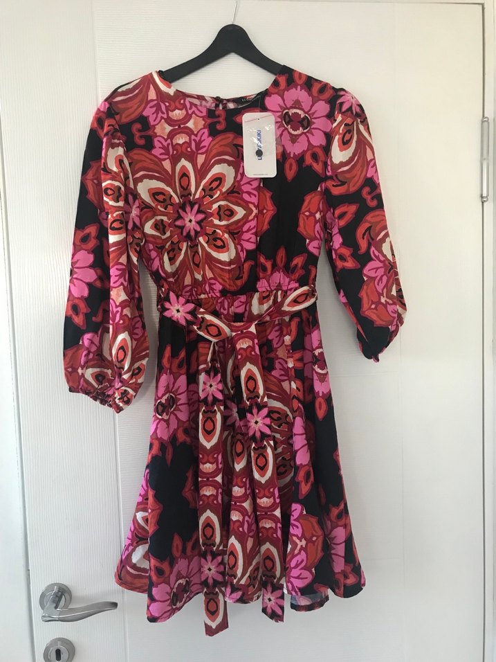 Bohem tarzı uzun kollu, V yakalı, bol kesim ve kemerli midi elbise. Koyu pembe desenli, romantik akşamlar için uygun.