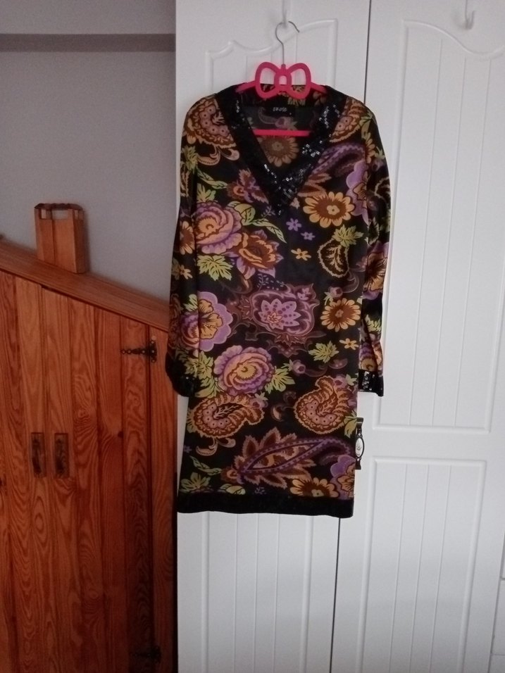 Yüksek yakalı, dökümlü tasarıma sahip uzun, bol kesim mor çiçek desenli tunik, yumuşak sentetik kumaştan yapılmıştır.