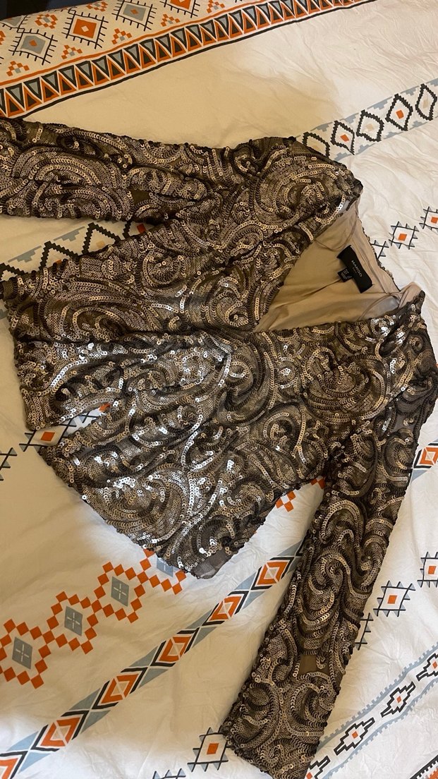 Bohem tarzda, uzun kollu, V yaka ve drapeli tasarıma sahip bol kesim kadın bluz. Koyu kahverengi desenli tekstil kumaştan, parti için uygun. ✨