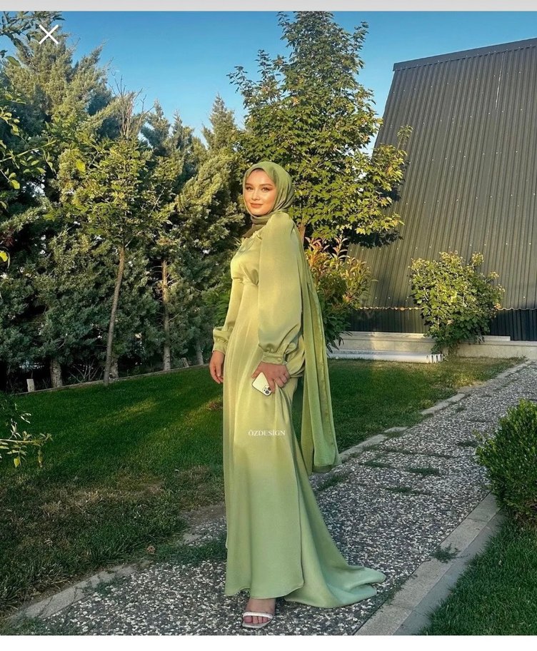 Pastel yeşil renkte, uzun kollu ve bol kesim kuyruklu balon kollu saten abiye elbise. Hiçbir kusuru yoktur bir kere kullanıldı. Düğünler için uygundur. 38beden Özdesign marka abiye elbise