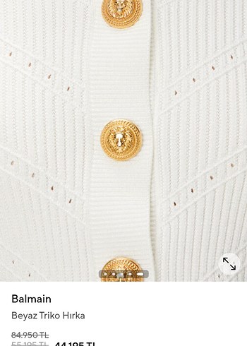 Pamuk dokulu, düğmeli beyaz hırka. Yuvarlak yaka ve uzun kollu, bol kesimdir. Bohem ve Paris tarzını yansıtan desenlidir, günlük kullanım için uygundur. BALMAİN marka kendinden dokumali süper hırka