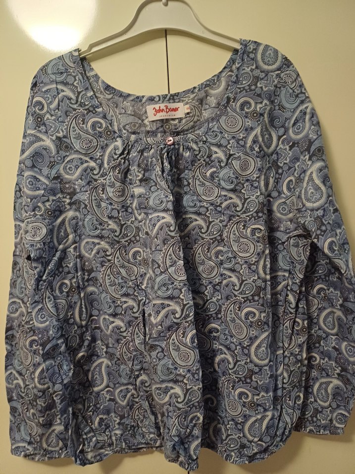 Pamuk kumaştan, bohem tarzda, uzun kollu ve düğmeli bluz. Mavi paisley desenli, rahat kesim, günlük kullanıma uygun. temiz kullanılmıştır herhangi bir sorunu yoktur yurtdışı ürünüdür