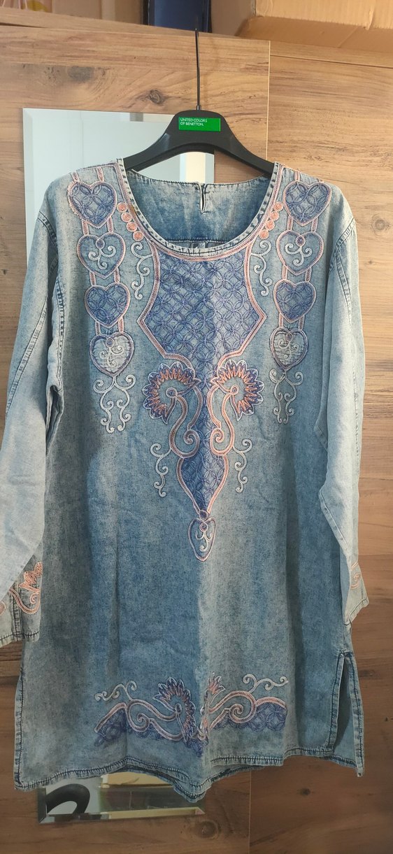 Uzun kollu, yuvarlak yakalı bol kesim uzun denim tunik. Bohem nakış ve düğme detaylarıyla günlük kullanıma uygun.