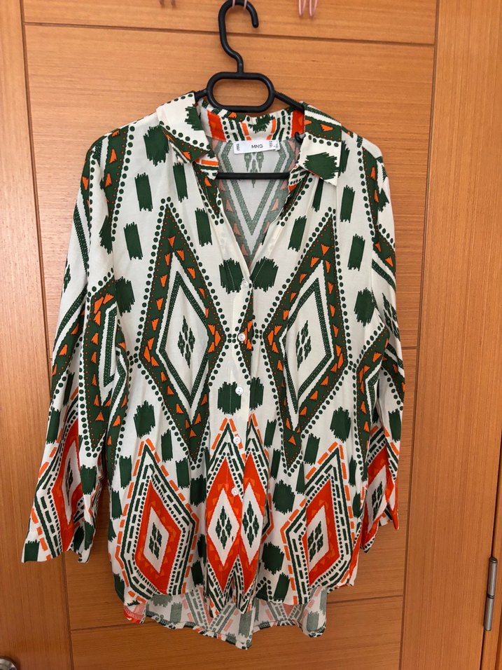 Bohem tarzda, uzun kollu ve V yakalı, düğmeli, kısa boyda, çok renkli geometrik desenli kadın gömleği. Rahat kesim, yumuşak kumaş.