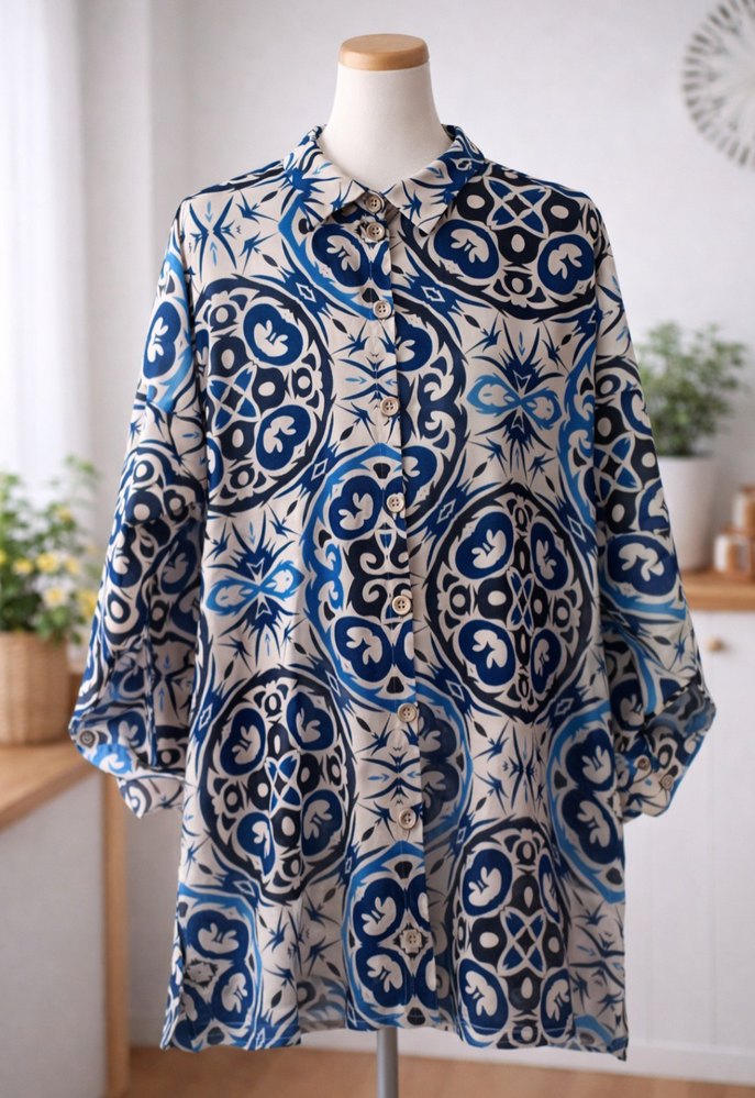 Mavi ve gri bohem desenli, düğmeli, uzun kollu, bol kesim kadın gömlek. Tekstil kumaştan, kayık yaka ve normal midi boyda.