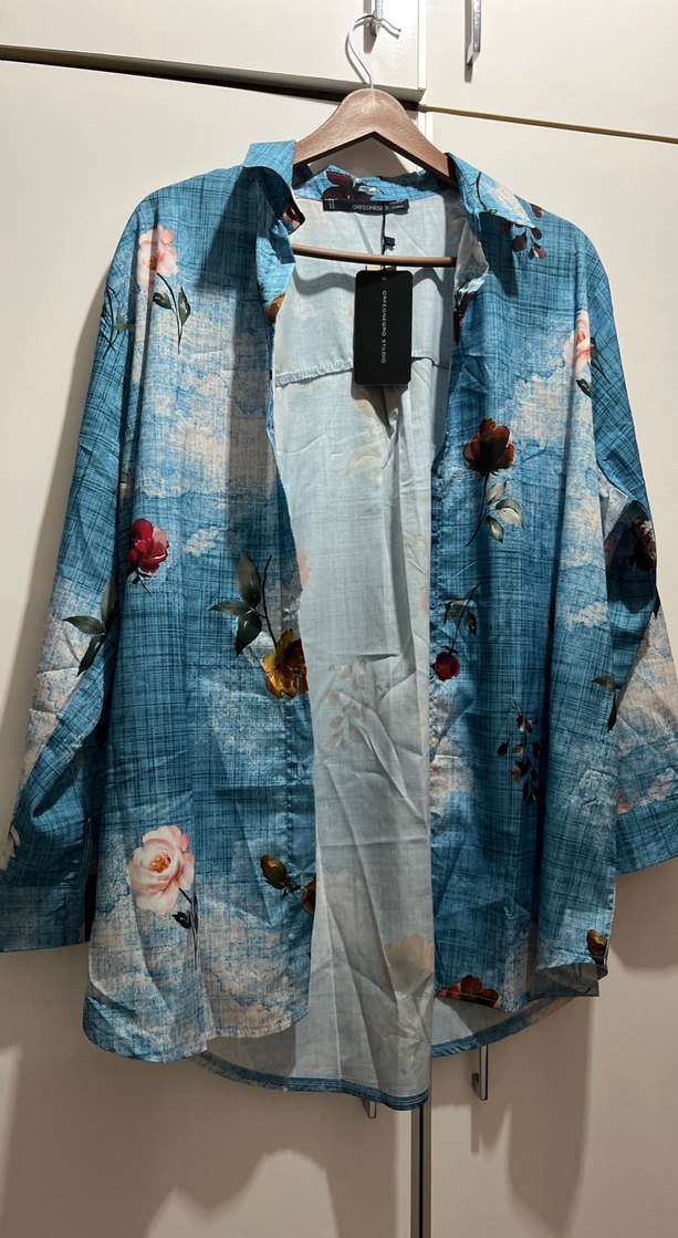Uzun kollu, düğmeli kadın gömleği. Mavi ve gri tonlarda tie-dye desenli, çiçek baskılı bohem tarzda. Notched lapel yaka ve bol kesim rahatlık sağlar.