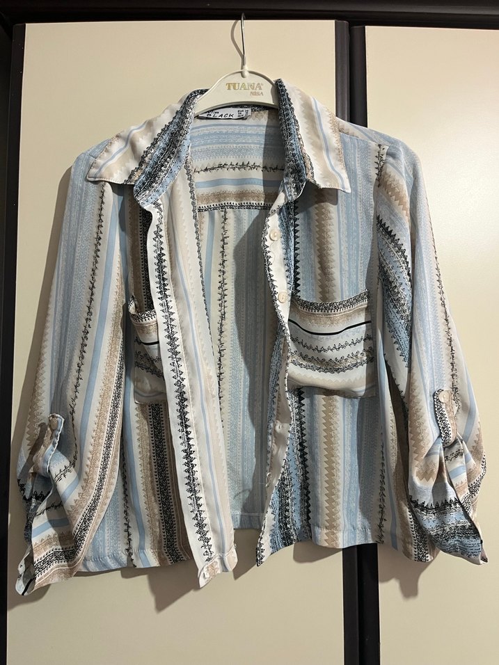 Bohem tarzda, düğmeli ve uzun kollu, yakalı kısa uzunlukta, bej ve gri tonlarında batik desenli, yumuşak dokulu gömlek.