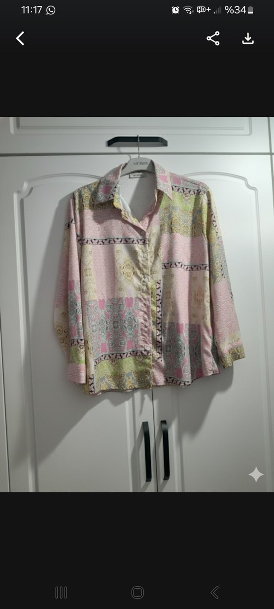 Bohem tarzda, yakalı, uzun kollu ve bol kesim kadın gömleği. Pastel çok renkli batik desenli, düğmeli ve yumuşak sentetik kumaştan. Günlük kullanım için uygun.