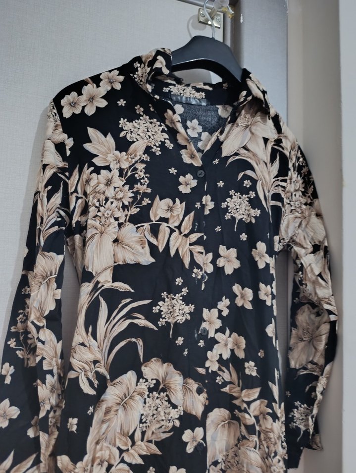 Bu hamile bluzu, uzun kollu ve bol kesimdir. Vintage çiçek desenli, V yaka ve düğmeli ön kısmı vardır. İpeksi kumaştan, koyu kahverengi tonlarında, günlük kullanıma uygundur.