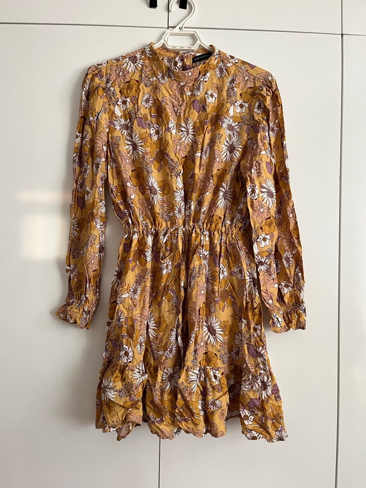 Açık kahverengi bohem tarzda, uzun kollu, yüksek yakalı ve bol kesimli fırfırlı midi elbise, günlük kullanım için uygundur.