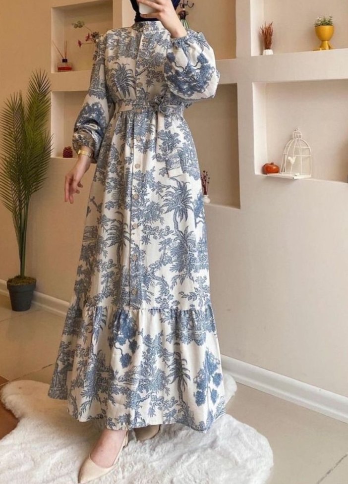 Bohem tarzda, uzun kollu, bol kesim, fırfır detaylı gri-mavi çiçek desenli elbise. Günlük kullanıma uygun, sentetik yumuşak kumaştan üretilmiştir. Boy 1.33 36-44 beden uyumludur