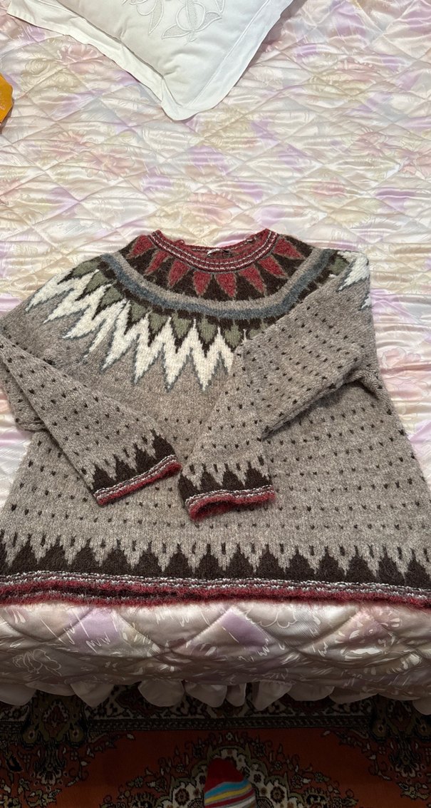 Gri renkli, yuvarlak yakalı ve uzun kollu bohem tarzında triko kazak. Geometrik desenler ve rahat kesimiyle gündelik kullanım için uygundur.