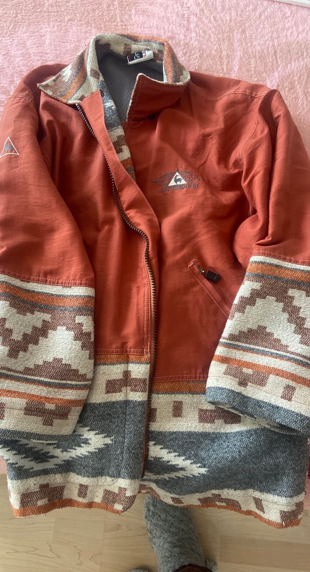 Kadınlar için uzun kesim, bol ve fermuarlı ceket. Koyu kahverengi tekstil gövde ve desenli kumaş detaylarıyla bohem, rahat stil sunar.