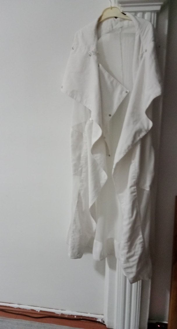Kadınlar için bohem tarzda, kolsuz, uzun ve bol kesim beyaz renkte sade bir kadın giyimi.ik kol arası 55 cm boyu 120 cm.çok tarz çok güzel.tertemiz kusursuz.bebe marka.kaliteli ürün.cepli model.ürün uzun yelek ama otomatik yükleme sabahlık kabul ediyor.düzeltemedim.