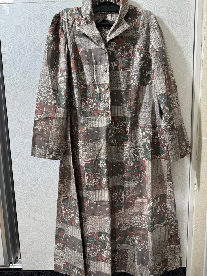 Bohem tarzı, uzun kollu ve bol kesim, vintage görünümlü kahverengi ve gri tonlarda uzun kadın hırkası.