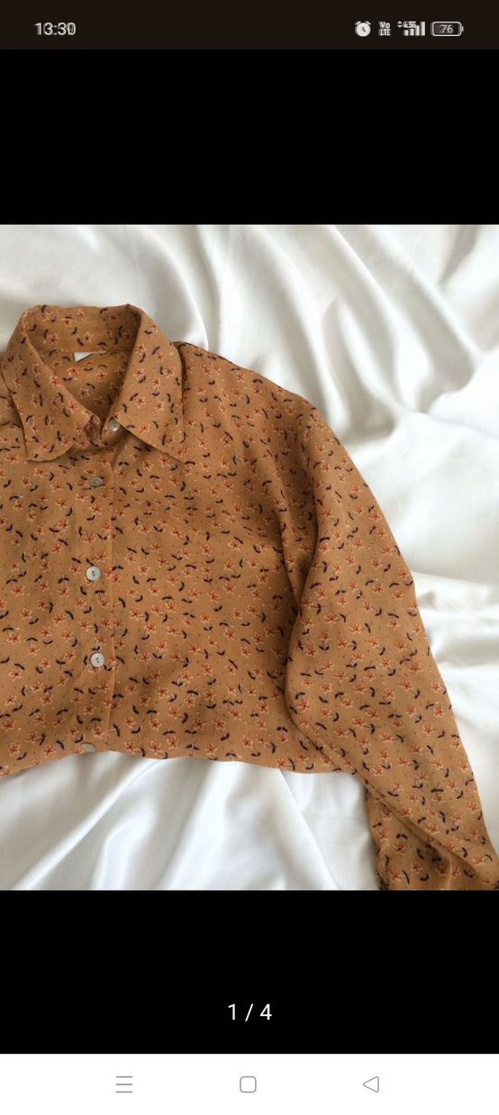 Bohem tarzı, düğmeli ve yakalı, bol kesim uzun kollu kahverengi keten gömlek, pastel baskılı desene sahip.