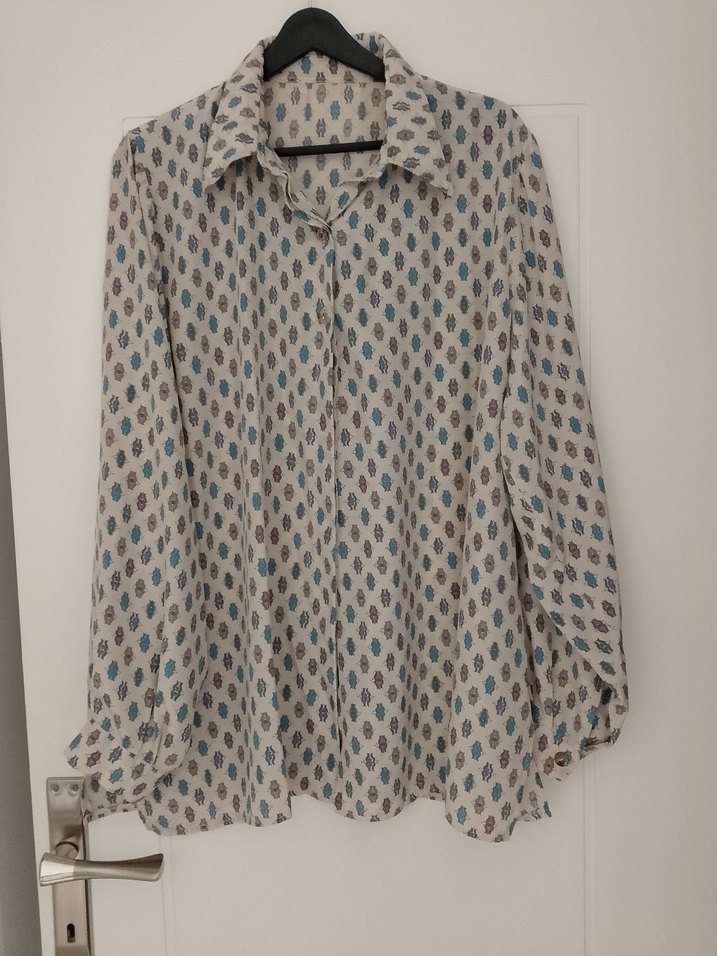 Uzun kollu, düğmeli, yakalı, bol kesim keten gömlek. Bej ve gri tonlarda batik desenli, günlük kullanıma uygun.