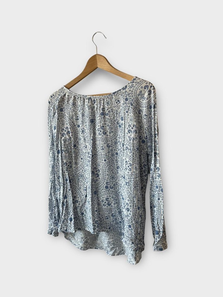 Yumuşak kumaştan, mavi ve beyaz batik desenli, uzun kollu, salaş kesim ve drapeli midi boy bohem bluz. 42 beden temiz kullanılmıştır. İki kol arası 58 cm ön uzunluk 65 cm, arka uzunluk 74 cm