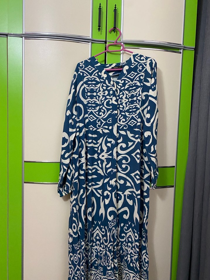 Uzun, bol kesim elbise, mavi beyaz bohem desenli, uzun kollu ve yüksek yakalıdır. Pliseli tasarıma sahip, rahat günlük kullanım için uygundur. Bilindik marka değilidr. Terzide daraltırılmıştır 44 46 beden uyumludur