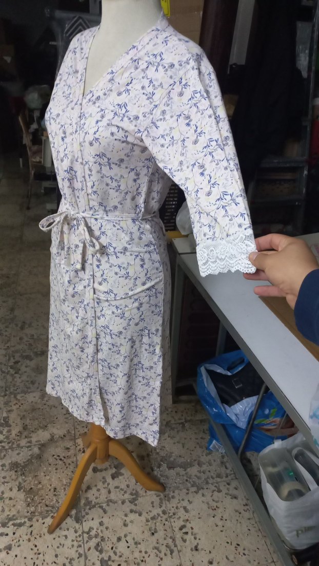 Kadınlar için bohem tarzda, uzun kollu ve midi boyda rahat kesim penye sabahlik. Beyaz zemin üzerine desenli, manşetlerde dantel detaylı ve belden bağlamalıdır.