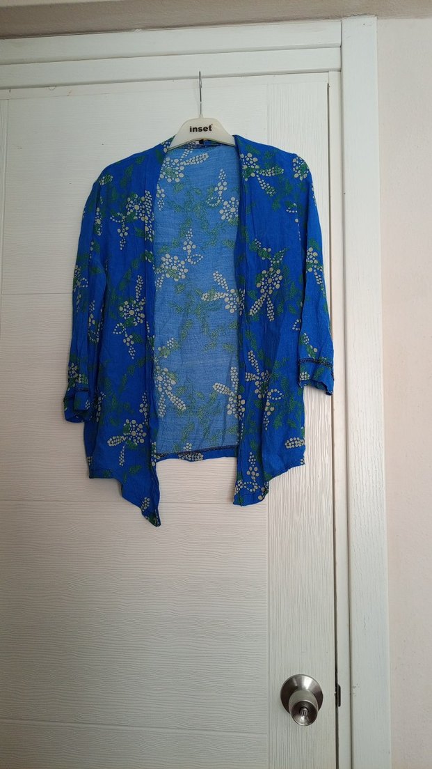 Renkli mavi batik desenli, uzun kollu, dökümlü ve kısa boy bohem kadın kimono. Notlu yaka ile rahat ve retro görünüme sahip.