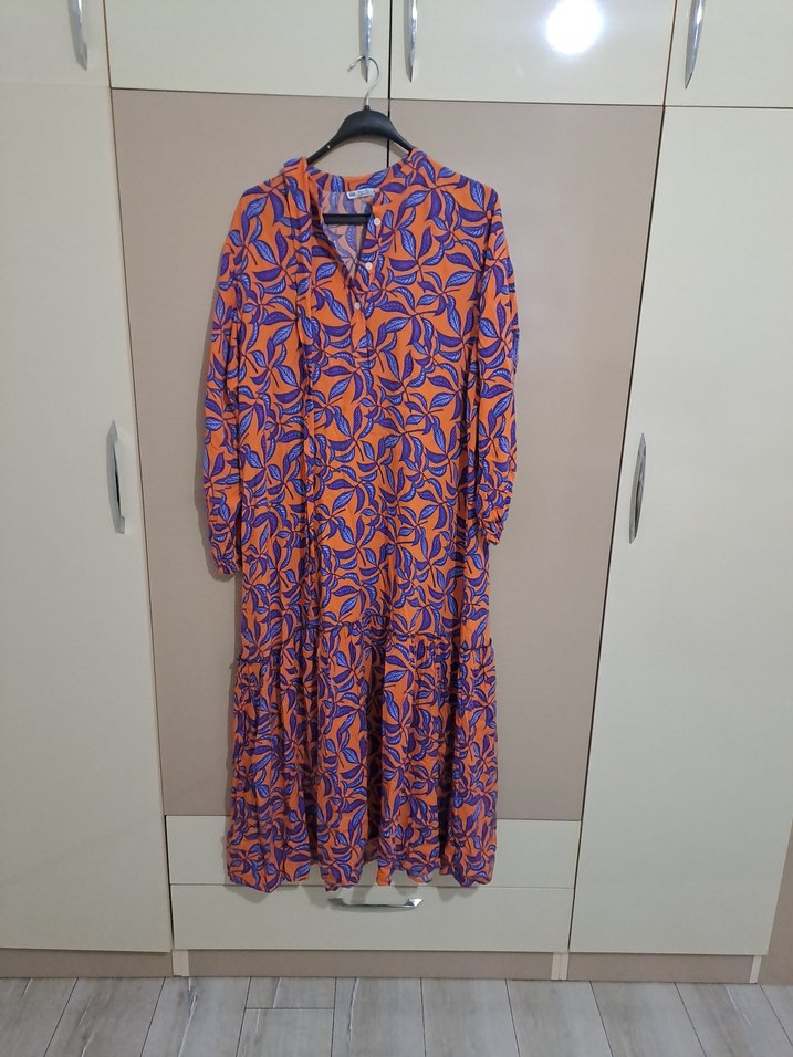 Bohem tarzda, uzun kollu ve yüksek yakalı, renkli tie-dye desenli, bol kesim ve pileli detaylı sentetik kumaş elbise.