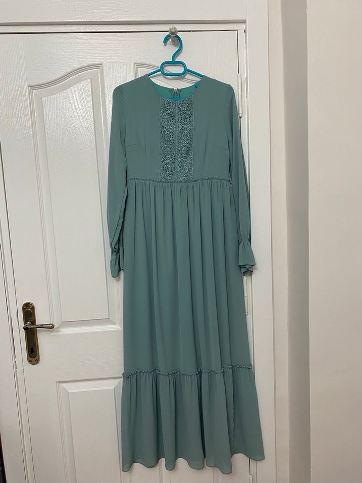 Turkuaz renkli, uzun kollu, yuvarlak yaka, nakış detaylı ve fırfır süslemeli bol kesim bohem uzun elbise. Günlük kullanıma uygundur. Markası yok millayı seçmek için seçtim