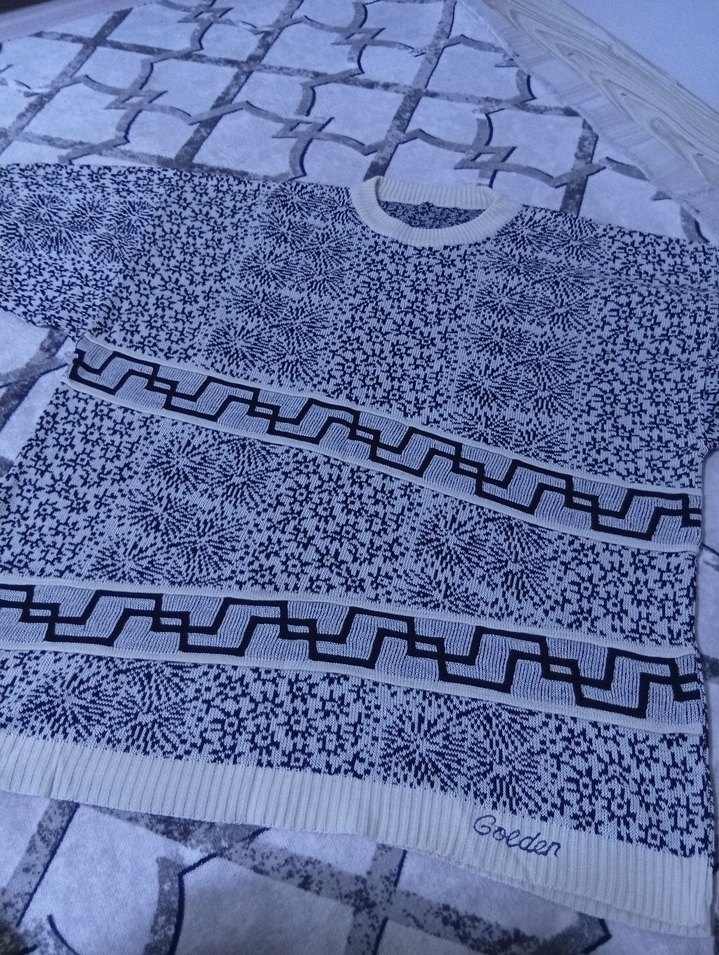 Gri ve beyaz renklerde, örgü desenli, bohem tarzda, uzun kollu ve uzun kesim kadın kazak. Salaş kesim ve yuvarlak yaka ile rahat bir kullanım sunar.