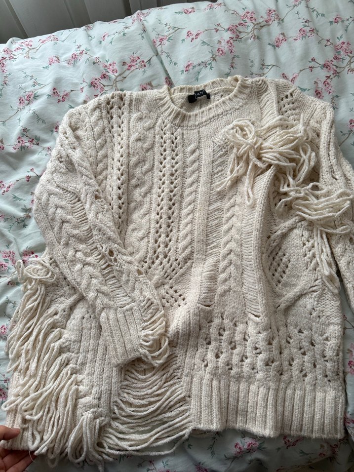Bohem tarzı, bol kesim ve uzun kollu kadın kazak. Yumuşak örgüden yapılmış, yuvarlak yakalı ve sade beyaz tasarıma sahip, günlük kullanıma uygun.