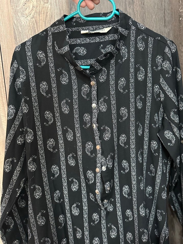 Bol kesim, uzun boylu, pamuklu kumaştan yapılmış, yakalı ve düğmeli uzun kollu gömlek. Siyah zemin üzerinde gri bohem desenlere sahiptir.