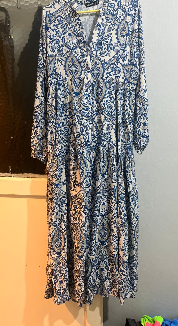 Mavi ve gri bohem bağlama desenli, uzun kollu ve kayık yaka, püskül detaylı pamuklu bol kesim uzun elbise. Yeni hiç giyilmedi
