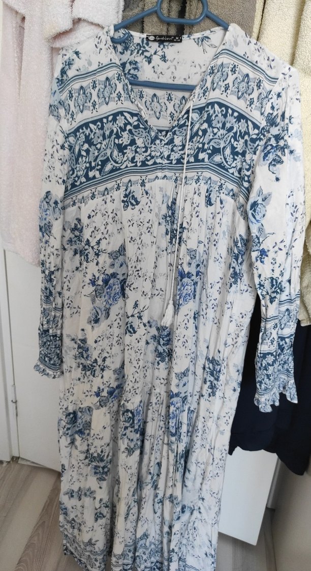Bohem tarzda, mavi desenli, pamuklu, uzun kollu, bol kesim ve V yakalı elbise. Drapeli detaylara sahiptir.