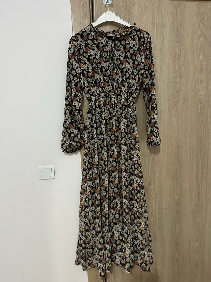 Yüksek yakalı, uzun kollu ve bol kesimli kahverengi uzun elbise. Yumuşak sentetik kumaştan, piliseli detaylı ve batik desenlidir, bohem tarzı yansıtır.