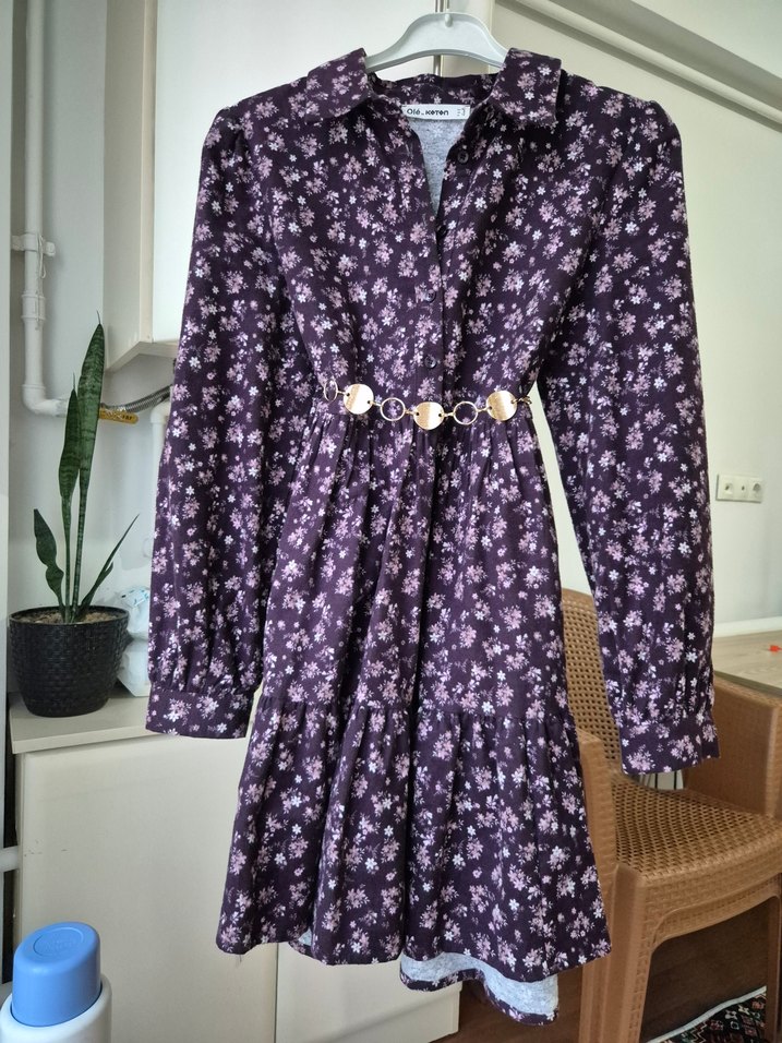 rahat kalıp uzun kollu, yüksek yakalı ve bol kesimdir. Mor tonlarında tie-dye desenli, fırfır detaylıdır. Yumuşak sentetik kumaştan üretilmiştir.