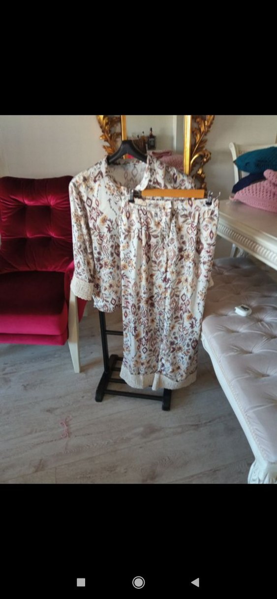 Bohem tarzda, krem renkte, desenli, uzun kollu ve bol kesim saten takımıdır. Rahat ve şık bir kıyafetidir.